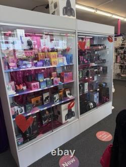 Up for sale is a Store Supply Warehouse 4-Wall Unit Display Case, model #65211. These are professional-grade, freestanding fixtures ideal for retail environments such as boutiques, electronic shops, or gift stores. Dimensions: 48"W x 18"D x 54H. Material: Durable laminate wood finish with chrome brackets. 4-wall design for 360° product visibility.
