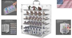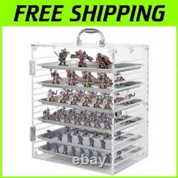 Clear Miniature Storage Case with Removable Trays and Protective Door - 15.6. Full View Design: Crafted from high-quality transparent acrylic, the display case offers uninterrupted views of your miniatures, showcasing your collection beautifully. Robust Structure: Made with 8mm thick solid acrylic sidewalls, this case ensures that trays won't fall off, providing the utmost protection for your beloved miniatures. Adjustable Metal Trays: The set includes 6 removable trays that can be magnetically secured (magnets not included), allowing for customizable arrangements and stability for magnetized miniatures.