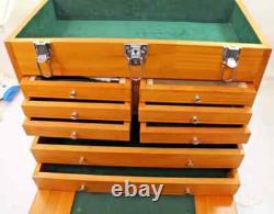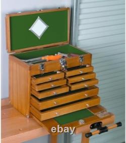 Hardwood in Walnut FINISH with a Green color felt (Knives shown not included). 20"L x 16"H x 11W. Six small drawers: Each measuring approximately 8 inches wide, 7.25 inches deep, and 1 inch high. Two large drawers: Each measuring approximately 17.625 inches wide, 7.25 inches deep, and 1.75 inches high.