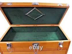 Stowing, slide-under door with lock. Green felt in each drawer. Rubber handle for easy lifting.Drawers providing much extra room storage. Lockable top storage compartment with 3 latches (1 locking) for added security. Brass-tone metal pulls, latches, locks, carry handles and corner reinforcements. Display, secure, and store your precious collectible items in this collector's cabinet display case.