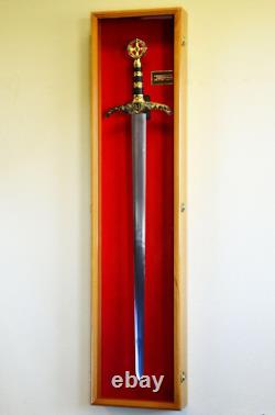 Mounts your sword Vertically and securely. 98% UV Ultra Clear Protected Acrylic Door. Fully Assembled With All Mounting Included. Dimensions: 54" x 12" x 3.5. Hand made of solid furniture-grade Australian beech hardwood, this display case is the perfect item to show off your sword.Display case features a locking acrylic door (98% UV resistant with two keys) to keep out dust and comes standard with RED or Black felt fabric background. Everything you need to mount the case and sword is included. Very easy to install takes 10 minutes.