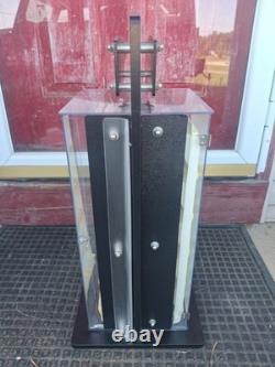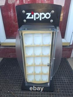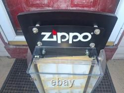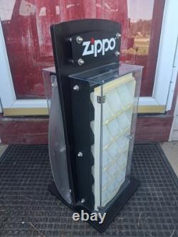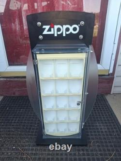 ZIPPO ROTATING STORE-COUNTER DISPLAY CASE-BEST OFFER-NO KEY. This is in good condition with a couple issues. No key included, the zippo case inserts have turned yellow in some areas. The last small flaw is a small hairline crack on the top (refer to photo of myself pointing). An overall must have for displaying your Zippo Collection!